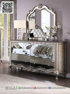 Meja konsol ini menghadirkan kesan mewah dan elegan dalam setiap detailnya. Terbuat dari kayu jati pilihan dan dilengkapi dengan finishing silver mirror yang berkilau, produk ini menjadi pilihan sempurna bagi anda yang ingin mempercantik ruangan dengan sentuhan klasik modern khas furniture jepara.