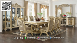 Meja makan klasik dima gold dari kayu solid menghadirkan sentuhan elegan dan mewah, cocok untuk ruang makan bergaya klasik dan penuh kehangatan.