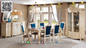 Hadir dengan desain klasik yang memancarkan kemewahan, meja makan klasik mewah dima kayu solid elegan blue ini menjadi pilihan sempurna untuk anda yang menginginkan ruang makan dengan nuansa berkelas dan hangat. Paduan warna blue velvet yang lembut dengan ukiran kayu solid bernuansa gold menciptakan tampilan mewah yang tidak berlebihan, cocok untuk berbagai gaya interior, baik klasik maupun modern elegan.