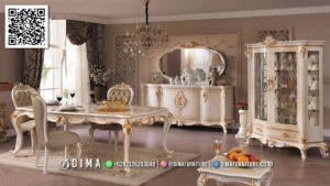 Jika anda ingin menghadirkan suasana ruang makan yang berkelas dan elegan, meja makan mewah klasik dima kayu solid gold elegan adalah pilihan sempurna. Selain indah secara visual, meja ini juga mencerminkan kemewahan dan cita rasa tinggi. Perpaduan warna ivory dan gold memberikan kesan hangat, romantis, dan mewah di waktu yang bersamaan.