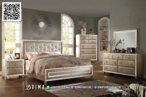Ingin punya kamar tidur dengan tampilan yang berkelas tapi tetap nyaman? Tempat tidur jepara elegan dima furniture gold series bisa jadi pilihan yang pas untuk anda. Mengusung desain klasik modern dengan sentuhan warna gold, set kamar tidur ini menghadirkan kesan hangat, elegan, dan mewah tanpa terlihat berlebihan.